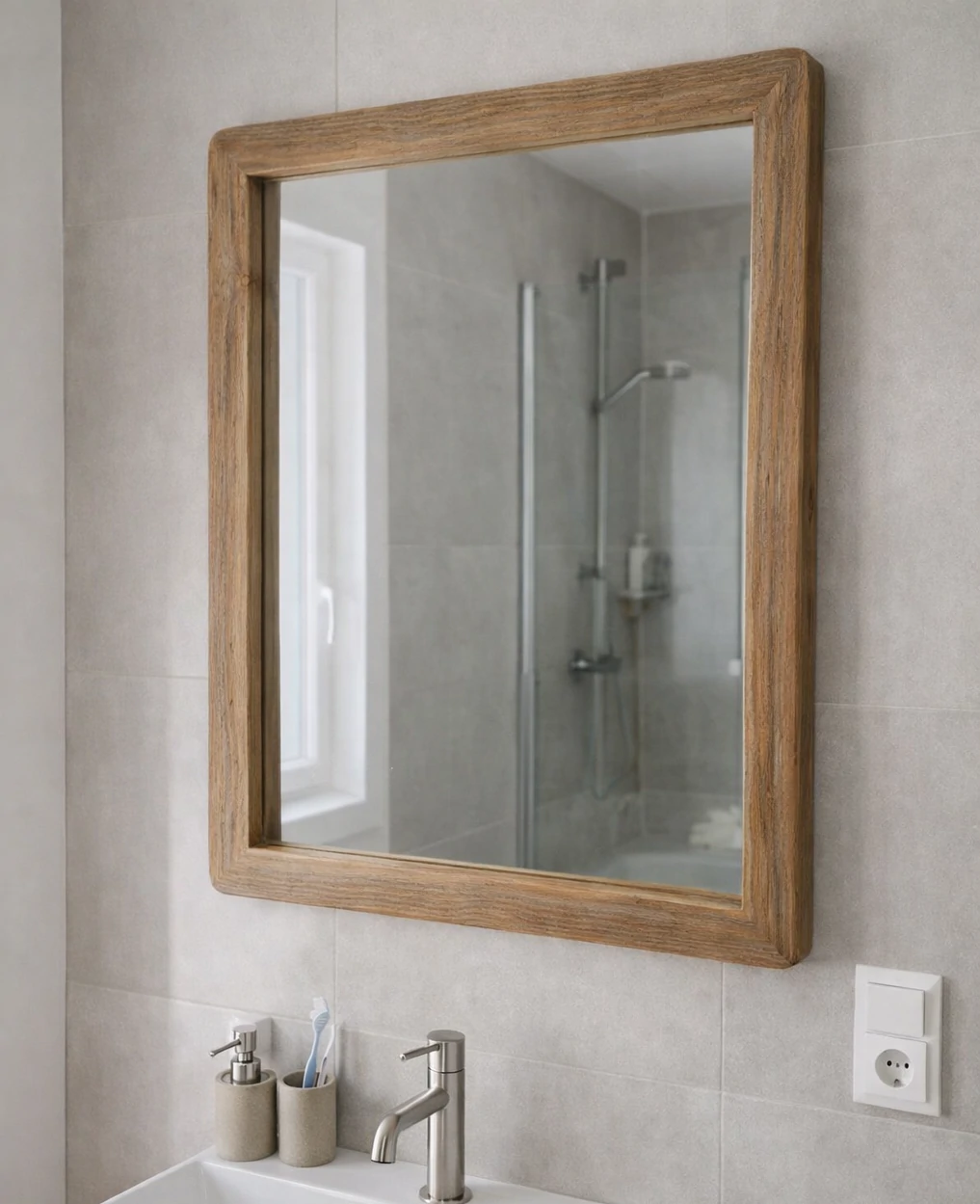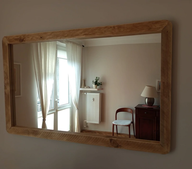 Lustro w drewnianej ramie na wymiar z zaokrąglonymi rogami to propozycja dla osób, które szukają subtelnego, miękkiego wizualnie wykończenia wnętrza. Rama wykonywana jest ręcznie z litego drewna i przygotowywana na indywidualny wymiar – zarówno pod względem rozmiaru, jak i szerokości listwy.